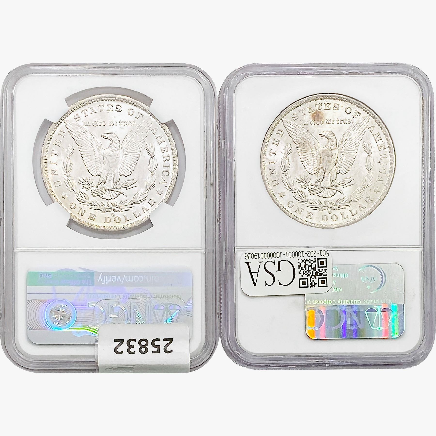 COINS AND CURRENCY LISTED IN GSA'S CATALOG AS GRADED AND ENCAPSULATED BY PCGS, NGC, ANACS, ICG, PCGS CURRENCY, PMG, PCGS BANKNOTE GRADING, CMC OR ANY OTHER THIRD-PARTY GRADING SERVICE ARE LIKEWISE SOLD "AS-IS" EXCEPT AS EXPRESSLY SET FORTH HEREIN. ALL THIRD-PARTY GRADING SERVICE GUARANTEES, INCLUDING AUTHENTICITY, ARE THE SOLE RESPONSIBILITY OF THE THIRD-PARTY GRADING SERVICE AND NOT WARRANTIES OR GUARANTEES OF GSA. BIDDERS SHOULD CONTACT THESE THIRD-PARTY GRADING SERVICES DIRECTLY WITH RESPECT TO ANY CLAIMS OR QUESTIONS THEY MAY HAVE CONCERNING THEIR GUARANTEES AND WARRANTIES. BIDDERS ACKNOWLEDGE AND AGREE THAT AUCTIONEER IS NOT BOUND BY OR LIABLE FOR ANY OPINION OR CERTIFICATION BY ANY THIRD-PARTY GRADING SERVICE. REMOVAL OF A PRODUCT FROM ITS PROTECTIVE CASING OR HOLDER OR ALTERATION OF ANY COIN HOLDER WAIVES ALL RIGHTS CONCERNING THE PRODUCT CONTAINED THEREIN.