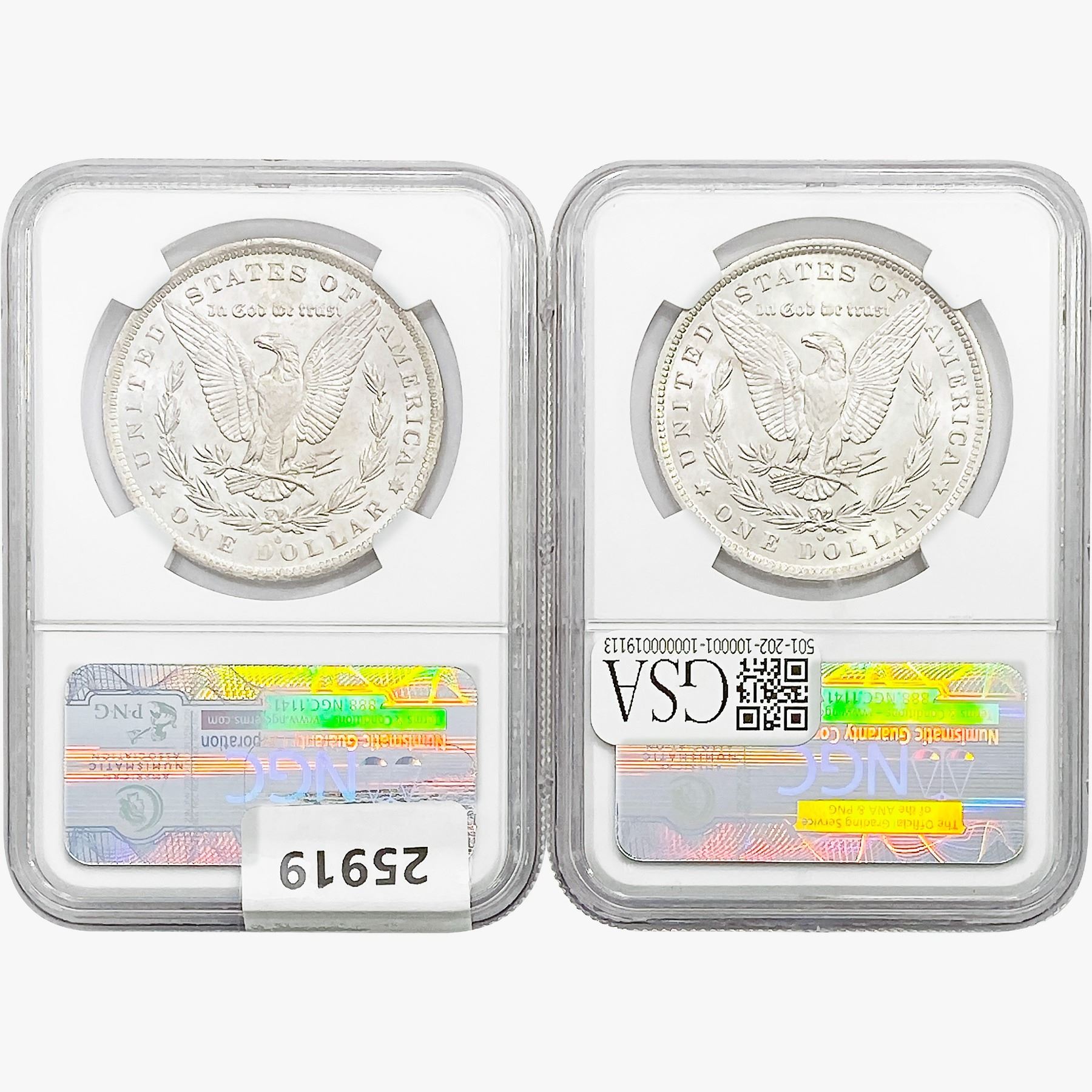 e. Coins sold referencing a third-party grading service are sold "AS IS" without any express or implied warranty, except for a guarantee by GSA that they are genuine. Removal or alteration of the holder, voids all of Bidder's claims concerning that Product. Certain warranties may be available from the grading services and Bidders are referred to them for further details: Numismatic Guaranty Corporation (NGC), PO Box 4776, Sarasota, FL 34230, www.ngccoin.com/services/writtenguarantee.asp; Professional Coin Grading Services (PCGS), PO Box 9458, Newport Beach, CA 92658, www.pcgs.com/guarantee.html; ANACS, 6555 S. Kenton St., Ste. 303, Englewood, CO 80111; and Independent Coin Grading Co. (ICG), 7901 East Bellview, Ave., Suite 50, Englewood, CO 80111.