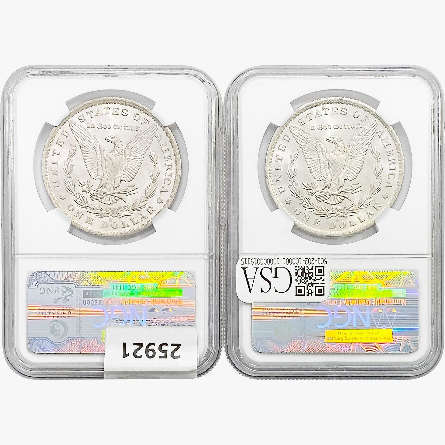 e. Coins sold referencing a third-party grading service are sold "AS IS" without any express or implied warranty, except for a guarantee by GSA that they are genuine. Removal or alteration of the holder, voids all of Bidder's claims concerning that Product. Certain warranties may be available from the grading services and Bidders are referred to them for further details: Numismatic Guaranty Corporation (NGC), PO Box 4776, Sarasota, FL 34230, www.ngccoin.com/services/writtenguarantee.asp; Professional Coin Grading Services (PCGS), PO Box 9458, Newport Beach, CA 92658, www.pcgs.com/guarantee.html; ANACS, 6555 S. Kenton St., Ste. 303, Englewood, CO 80111; and Independent Coin Grading Co. (ICG), 7901 East Bellview, Ave., Suite 50, Englewood, CO 80111.