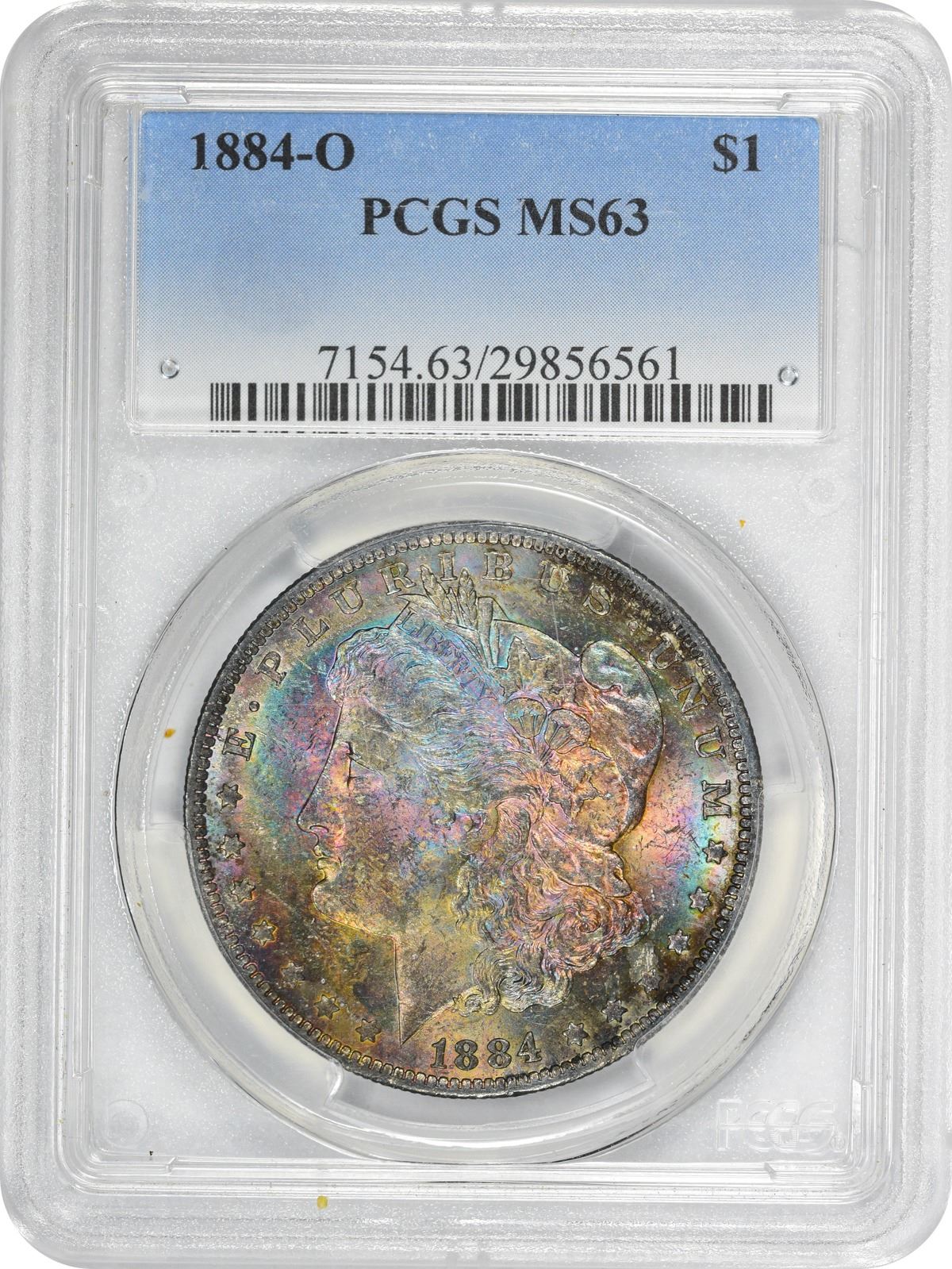 Gun-metal blue and shades of violet iridescence vie for dominance on both sides of this attractive and colorful Morgan dollar. PCGS #7154