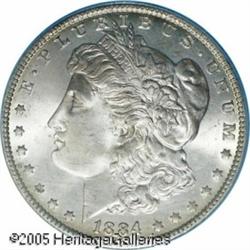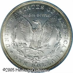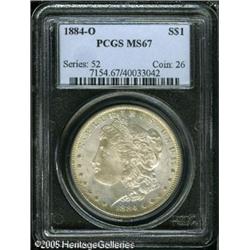 <B>1884-O<img border='0' src='http://www.heritagecoins.com/images/star.gif' width=10 height=10>$1 MS67 PCGS.</B></I> The 1884-O is a common coin in mint condition and lower grade examples are always available, sometimes still in roll quantity. Once one crosses the MS66 threshold, however, the landscape changes dramatically. Only 83 coins have been certified in MS67 from both of the major services with one finer (a PCGS coin) according to the January data. As one would expect, this is a fabulous coin that shows no obvious abrasions on either side. The smooth, silky mint luster is overlaid by a light hint of lilac-golden toning that deepens only slightly around the margins. Sharply defined throughout, this is a definite example of this popular early O-mint dollar.<BR><I>From The Banks Collection.</B></I> Lot:10167