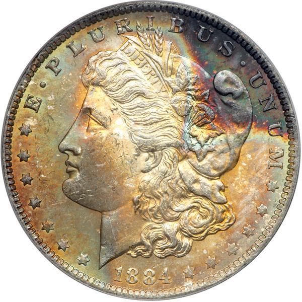 1884-O, 1885-O. PCGS graded each MS-63. Both dollars exhibit beautiful obverse toning with mostly blast white reverses. Lot of 2 coins (PCGS # 7154) .