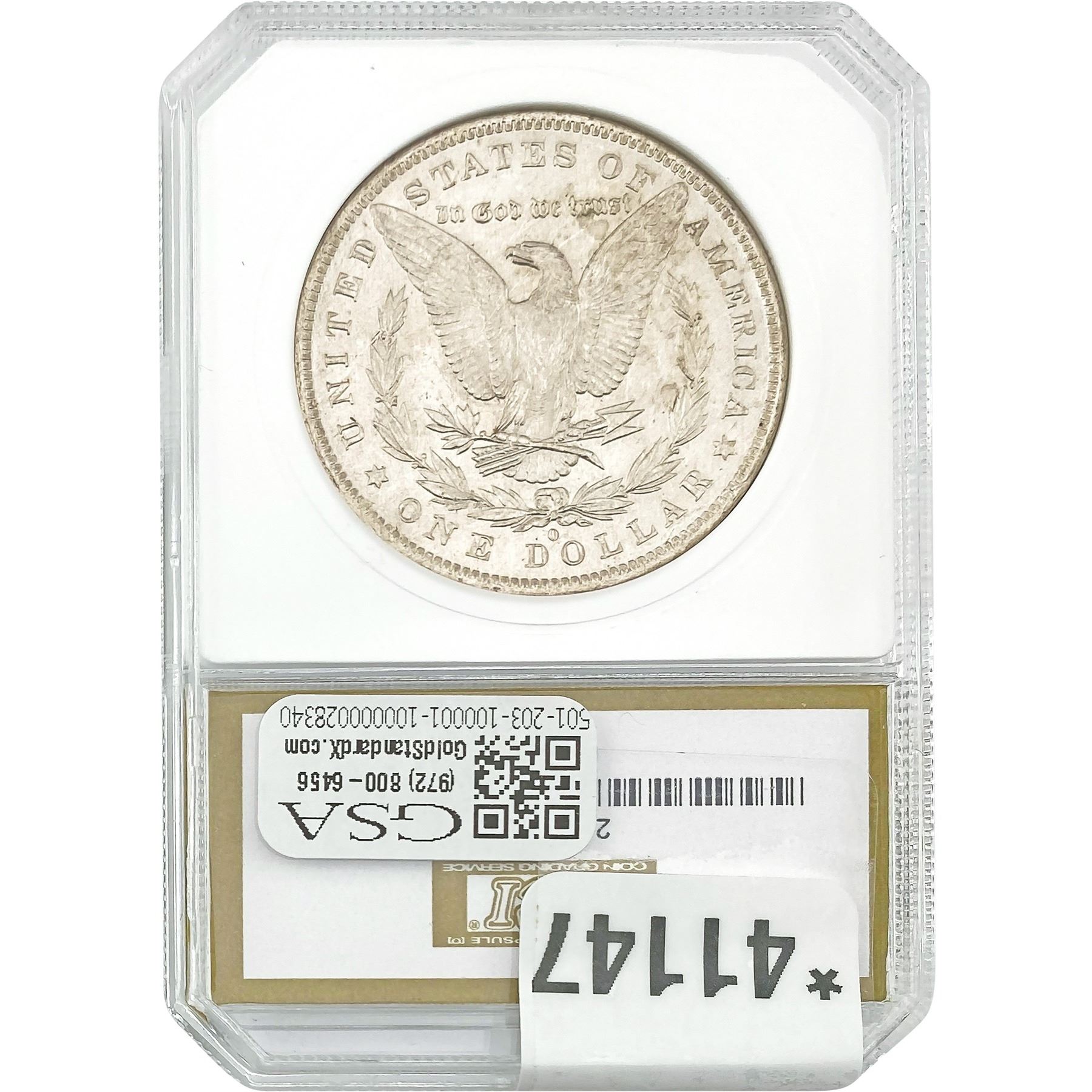 COINS AND CURRENCY LISTED IN GSA’S CATALOG AS GRADED AND ENCAPSULATED BY PCGS, NGC, ANACS, ICG, PCGS CURRENCY, PMG, PCGS BANKNOTE GRADING, CMC OR ANY OTHER THIRD-PARTY GRADING SERVICE ARE LIKEWISE SOLD “AS-IS” EXCEPT AS EXPRESSLY SET FORTH HEREIN. ALL THIRD-PARTY GRADING SERVICE GUARANTEES, INCLUDING AUTHENTICITY, ARE THE SOLE RESPONSIBILITY OF THE THIRD-PARTY GRADING SERVICE AND NOT WARRANTIES OR GUARANTEES OF GSA. BIDDERS SHOULD CONTACT THESE THIRD-PARTY GRADING SERVICES DIRECTLY WITH RESPECT TO ANY CLAIMS OR QUESTIONS THEY MAY HAVE CONCERNING THEIR GUARANTEES AND WARRANTIES. BIDDERS ACKNOWLEDGE AND AGREE THAT AUCTIONEER IS NOT BOUND BY OR LIABLE FOR ANY OPINION OR CERTIFICATION BY ANY THIRD-PARTY GRADING SERVICE. REMOVAL OF A PRODUCT FROM ITS PROTECTIVE CASING OR HOLDER OR ALTERATION OF ANY COIN HOLDER WAIVES ALL RIGHTS CONCERNING THE PRODUCT CONTAINED THEREIN.
