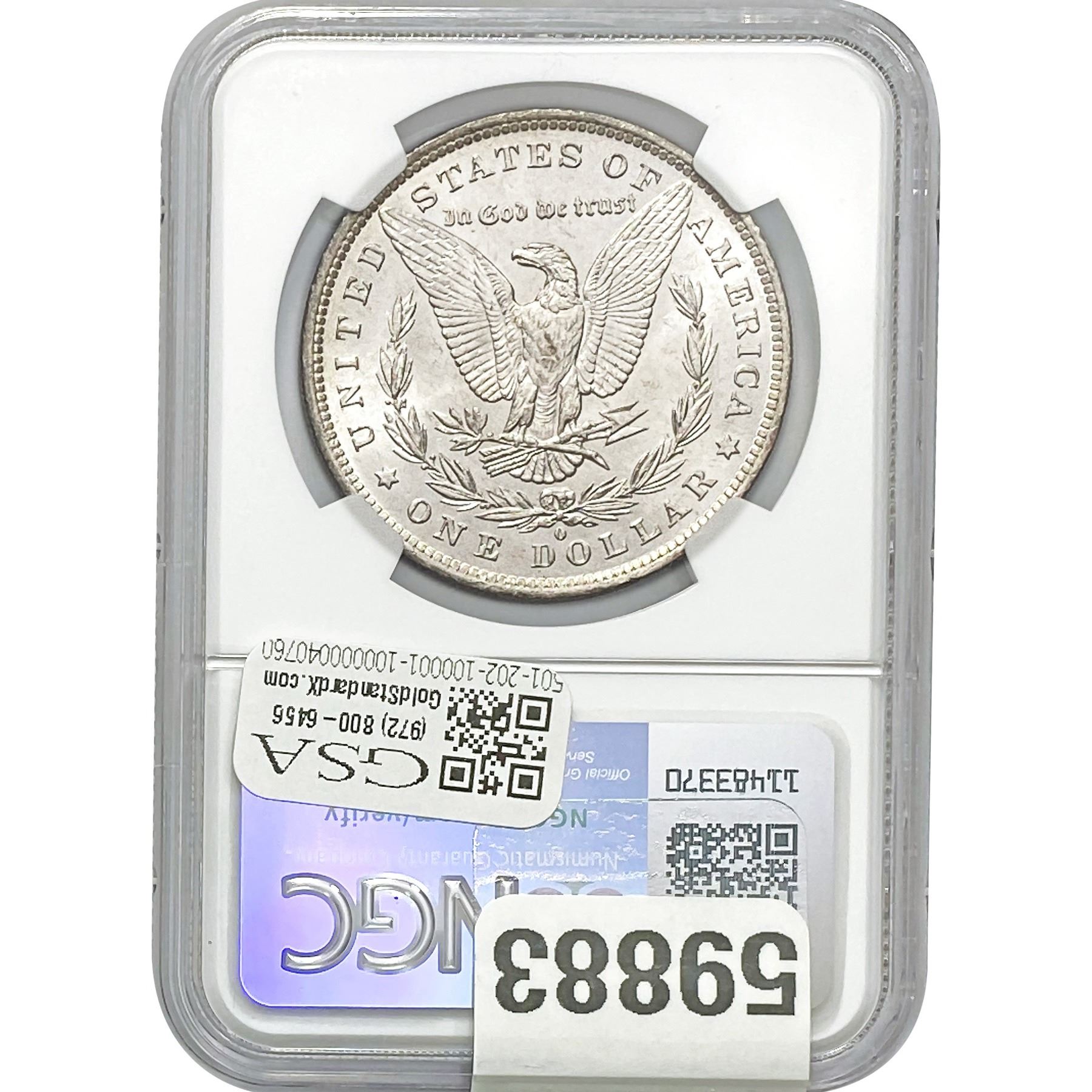e. Coins sold referencing a third-party grading service are sold “AS IS” without any express or implied warranty, except for a guarantee by GSA that they are genuine. Removal or alteration of the holder, voids all of Bidder’s claims concerning that Product. Certain warranties may be available from the grading services and Bidders are referred to them for further details: Numismatic Guaranty Corporation (NGC), PO Box 4776, Sarasota, FL 34230, www.ngccoin.com/services/writtenguarantee.asp; Professional Coin Grading Services (PCGS), PO Box 9458, Newport Beach, CA 92658, www.pcgs.com/guarantee.html; ANACS, 6555 S. Kenton St., Ste. 303, Englewood, CO 80111; and Independent Coin Grading Co. (ICG), 7901 East Bellview, Ave., Suite 50, Englewood, CO 80111.