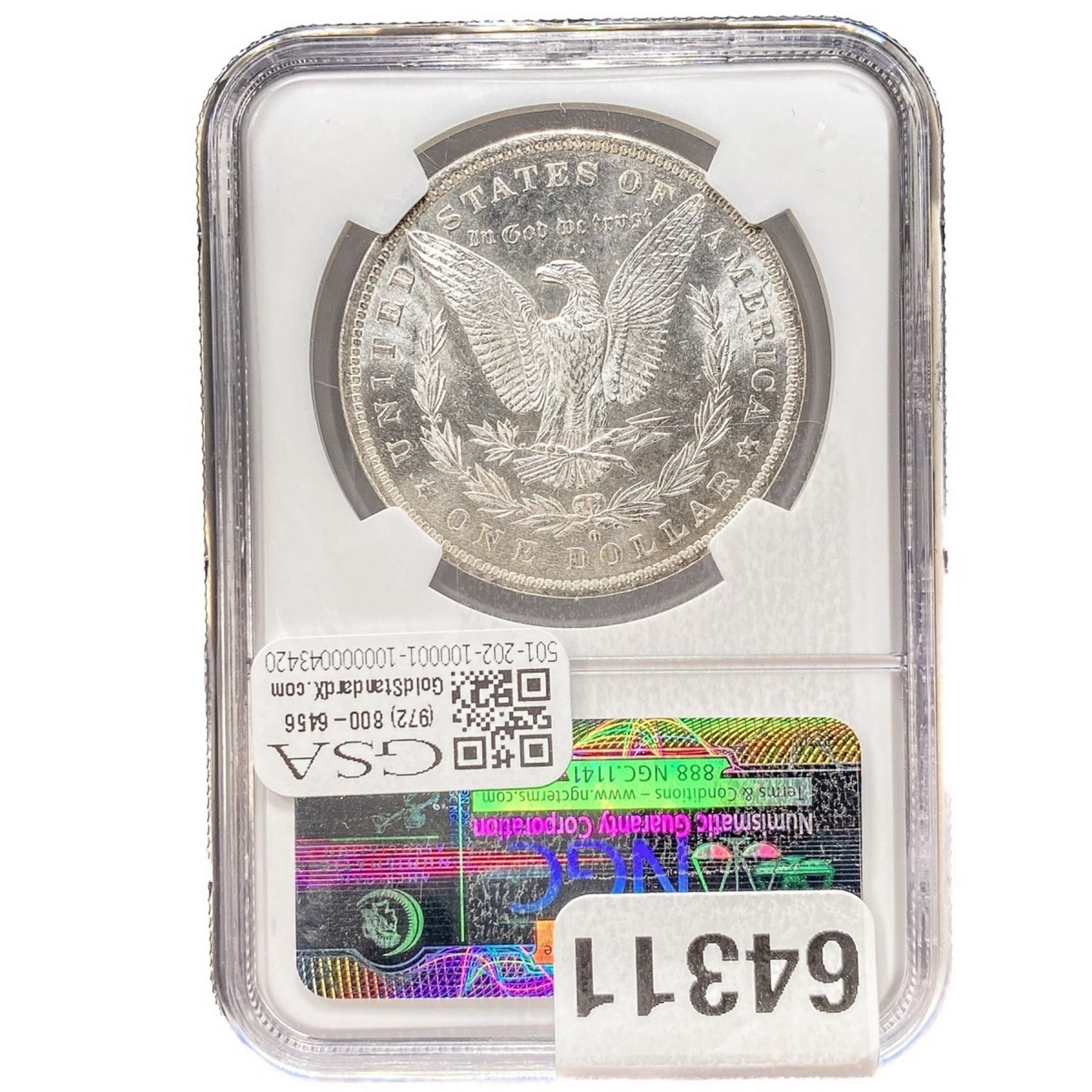 e. Coins sold referencing a third-party grading service are sold “AS IS” without any express or implied warranty, except for a guarantee by GSA that they are genuine. Removal or alteration of the holder, voids all of Bidder’s claims concerning that Product. Certain warranties may be available from the grading services and Bidders are referred to them for further details: Numismatic Guaranty Corporation (NGC), PO Box 4776, Sarasota, FL 34230, www.ngccoin.com/services/writtenguarantee.asp; Professional Coin Grading Services (PCGS), PO Box 9458, Newport Beach, CA 92658, www.pcgs.com/guarantee.html; ANACS, 6555 S. Kenton St., Ste. 303, Englewood, CO 80111; and Independent Coin Grading Co. (ICG), 7901 East Bellview, Ave., Suite 50, Englewood, CO 80111.