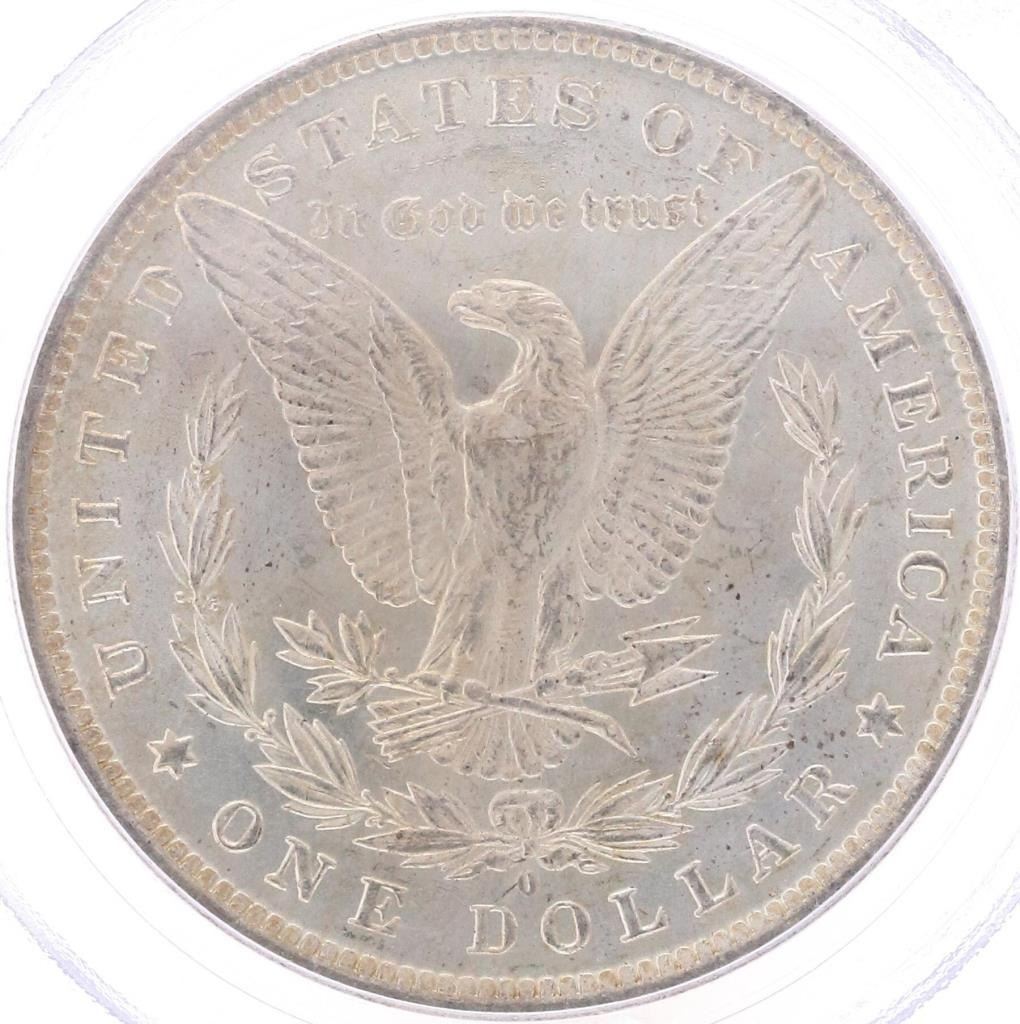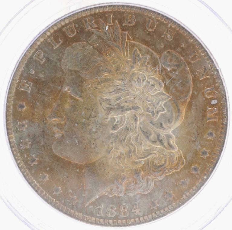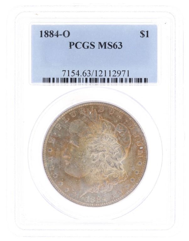 Featured in this lot is this 1884-O Morgan silver dollar professionally graded by Professional Coin Grading Service; the coin was graded a MS63 and was minted in New Orleans. The coin features a Liberty lady Cameo and reads, “E. Pluribus Unum – 1884”. The opposite side features a bald eagle with arrows and an olive branch and reads, “United States of America - In God We Trust - One Dollar”. The coin features rainbow gold toning with a observe brilliant white on the other side. The condition of this coin is good, with no obvious signs of damage; the coin is well preserved behind a hermetically sealed plastic case. The measurements of this coin case are 3 1/4" x 2 1/2" x 3/8".
