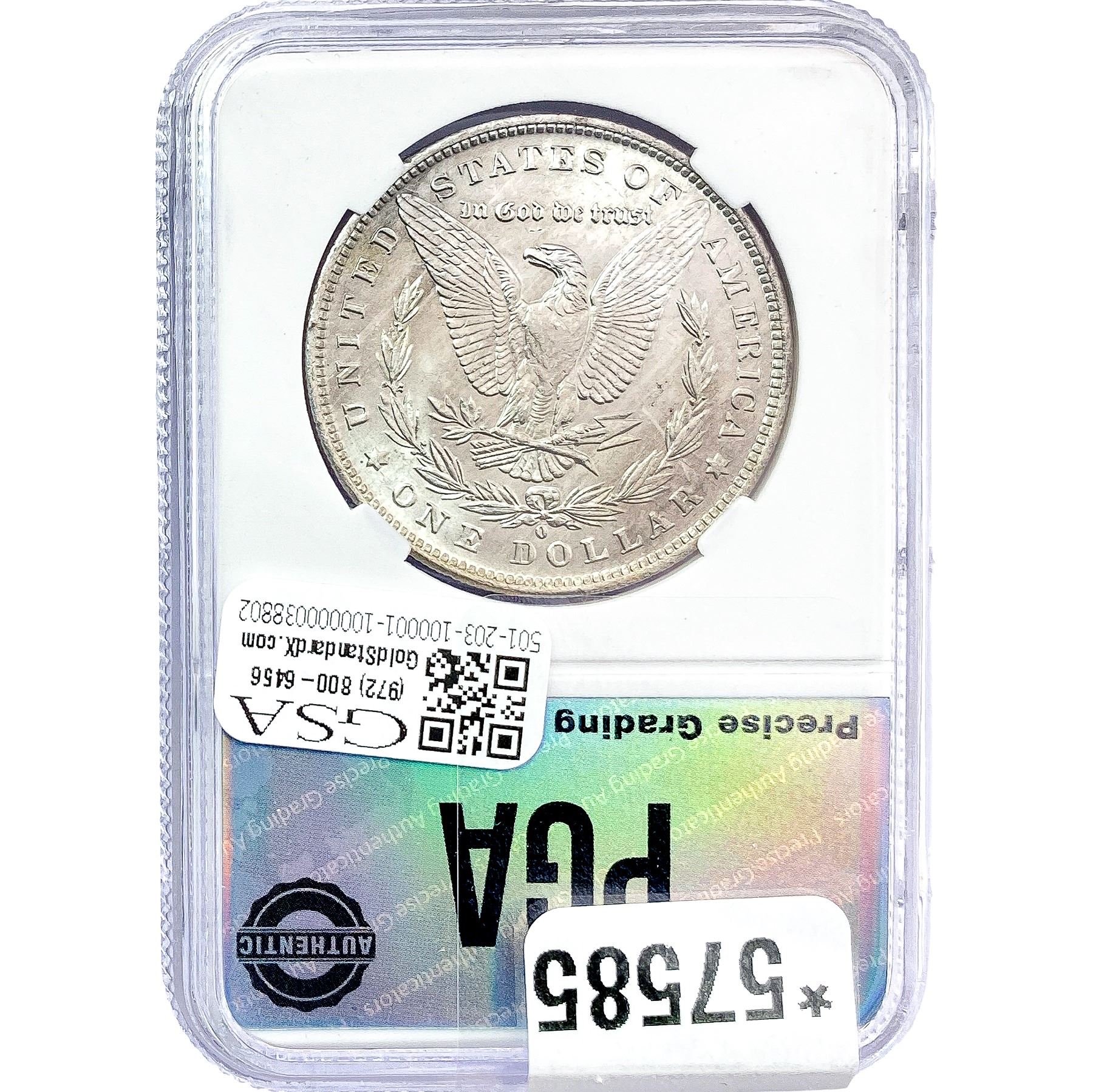 COINS AND CURRENCY LISTED IN GSA’S CATALOG AS GRADED AND ENCAPSULATED BY PCGS, NGC, ANACS, ICG, PCGS CURRENCY, PMG, PCGS BANKNOTE GRADING, CMC OR ANY OTHER THIRD-PARTY GRADING SERVICE ARE LIKEWISE SOLD “AS-IS” EXCEPT AS EXPRESSLY SET FORTH HEREIN. ALL THIRD-PARTY GRADING SERVICE GUARANTEES, INCLUDING AUTHENTICITY, ARE THE SOLE RESPONSIBILITY OF THE THIRD-PARTY GRADING SERVICE AND NOT WARRANTIES OR GUARANTEES OF GSA. BIDDERS SHOULD CONTACT THESE THIRD-PARTY GRADING SERVICES DIRECTLY WITH RESPECT TO ANY CLAIMS OR QUESTIONS THEY MAY HAVE CONCERNING THEIR GUARANTEES AND WARRANTIES. BIDDERS ACKNOWLEDGE AND AGREE THAT AUCTIONEER IS NOT BOUND BY OR LIABLE FOR ANY OPINION OR CERTIFICATION BY ANY THIRD-PARTY GRADING SERVICE. REMOVAL OF A PRODUCT FROM ITS PROTECTIVE CASING OR HOLDER OR ALTERATION OF ANY COIN HOLDER WAIVES ALL RIGHTS CONCERNING THE PRODUCT CONTAINED THEREIN.