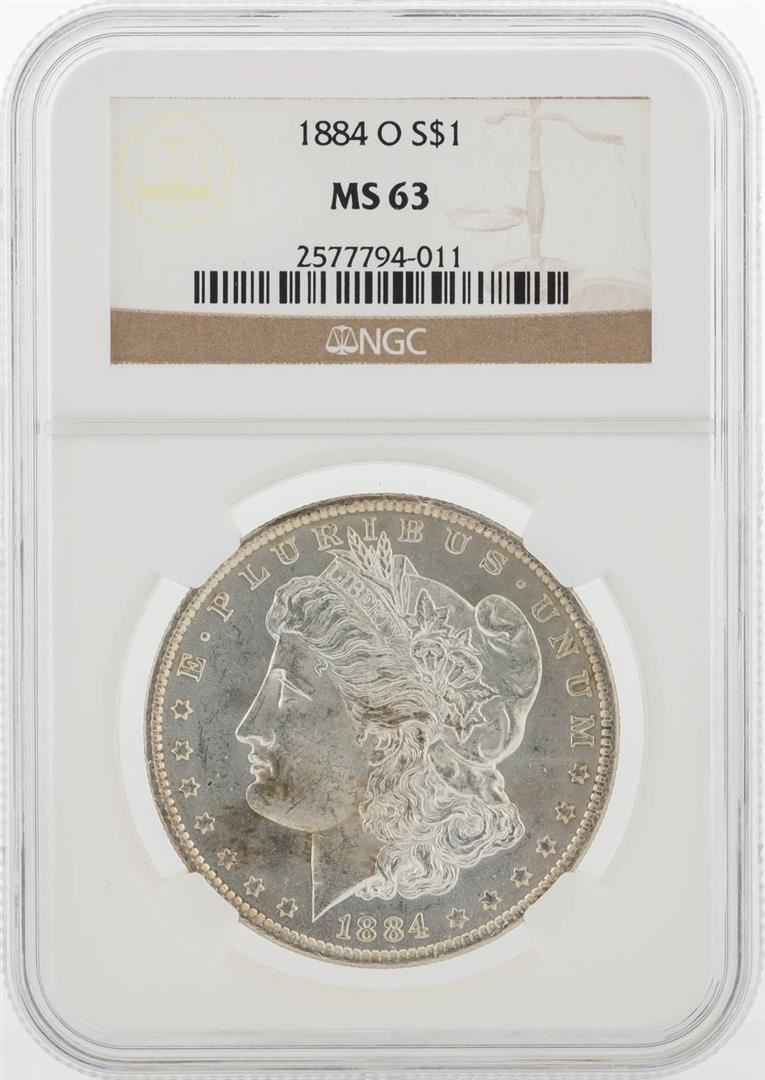 One 1884-O NGC MS63 Morgan Silver Dollar.
