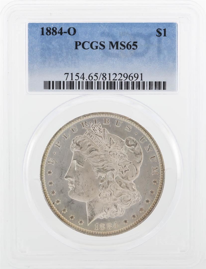 One 1884-O PCGS MS65 Morgan Silver Dollar.