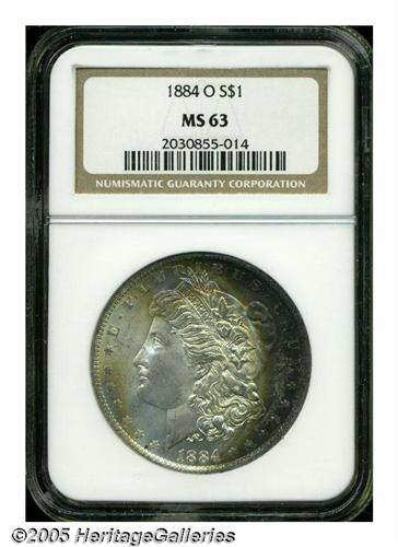 <B>1884-O<S$1> MS63 NGC,</B></I> bands of ruby-red, gold, and plum color on the upper obverse; <B>1884-O MS63 NGC,</B></I> mauve-red, sea-green, and honey patina covers the moderately abraded left obverse; <B>1884-O MS63 NGC,</B></I> powder-blue, gold, and mauve colors are especially strong on the right obverse; <B>1884-O MS63 <S NGC,</B></I> an impressive piece that exhibits blushes of rose-red, sea-green, and lemon color; <B>1884-O MS63 <S NGC,</B></I> vivid fire-red, apple-green, and peach colors dominate the slightly scuffed lower left obverse; <B>1884-O MS64 NGC,</B></I> an arc of deep mauve-red and emerald-green colors consumes about half of the obverse; and an <B>1884-O MS64 <S NGC,</B></I> radiant apricot, rose, and aquamarine patina fills the obverse.