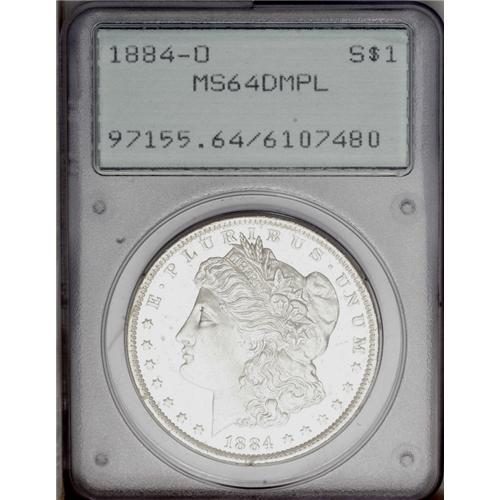 <B>1884-O<img border='0' src='http://www.heritagecoins.com/images/star.gif' width=10 height=10>$1> MS64 Deep Mirror Prooflike PCGS.</B></I> Frosty devices contrast with profoundly mirrored fields. A boldly struck and clean-cheeked near-Gem. Certified in a first generation holder. <BR><BR><B>Important notice:</B> Heritage usually auctions material at the rate of 200-250 lots per hour. On some occasions eBay Live bid software or the Internet may not be able to keep up with the pace of the auction. We recommend placing a realistic absentee bid now as insurance to avoid disappointment. Occasionally the auctioneer may eliminate or reject an eBay Live bid, and the auctioneer may also reopen a lot after the close of the eBay live bidding (usually because we missed an audience bid), and may reject your bid even if it shows you as the winning bidder. By bidding via eBay Live, you agree that Heritage may award the lot to another bidder at its sole discretion under the circumstances described above or any other reasonable circumstances. Since eBay bids are not shown to us until we open the lot on the floor, we treat those bids just like floor bids. In most cases the floor responds before the eBay bid is presented to us, due to Internet lag time, so for consistency we have made it a policy that floor bids are always considered first over tie eBay live bids. Also please note that all Heritage lots purchased through eBay Live carry a 20% Buyer's Premium. Please make sure you read the Terms and Conditions before you bid. This lot is being auctioned in conjunction with a live floor auction by Heritage Galleries & Auctioneers. All final auction and invoice information will be supplied by Heritage Galleries & Auctioneers, and all other information should be considered preliminary. Lot:3404 <BR><BR><B>Winning Notification and Billing:</B> After the FINAL session in this auction is complete, Heritage will send e-mail and snail mail invoices. This process normally takes several days. All final auction and invoice information will be supplied by Heritage Galleries & Auctioneers, and all other information should be considered preliminary. <BR><BR>This auction will be conducted on a live auction floor and over the Internet through eBay Live. If you choose to place an absentee bid, please take a moment to <font color='#0000ff'><u><a href='http://pages.ebay.com/liveauctions/help/before/laabsentee.html'>learn how eBay Live absentee bidding works</a></u></font><font color='#000000'>
