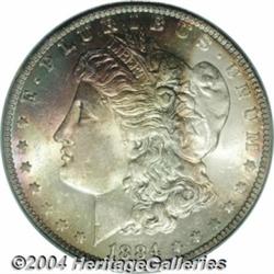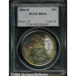 <B>1884-O<S$1> MS64 PCGS.</B></I> Colorful, multicolored iridescence blankets each side with a small area of brilliance at the right portion of the obverse. A well toned specimen with a few minor marks on the obverse.<BR><I>From the JFS Collection.</B></I> <BR><BR><B>Important notice:</B> Heritage usually auctions material at the rate of 200-250 lots per hour. On some occasions eBay Live bid software or the Internet may not be able to keep up with the pace of the auction. We recommend placing a realistic absentee bid now as insurance to avoid disappointment. Occasionally the auctioneer may eliminate or reject an eBay Live bid, and the auctioneer may also reopen a lot after the close of the eBay live bidding (usually because we missed an audience bid), and may reject your bid even if it shows you as the winning bidder. By bidding via eBay Live, you agree that Heritage may award the lot to another bidder at its sole discretion under the circumstances described above or any other reasonable circumstances. Since eBay bids are not shown to us until we open the lot on the floor, we treat those bids just like floor bids. In most cases the floor responds before the eBay bid is presented to us, due to Internet lag time, so for consistency we have made it a policy that floor bids are always considered first over tie eBay live bids. Also please note that all Heritage lots purchased through eBay Live carry a 20% Buyer's Premium. Please make sure you read the Terms and Conditions before you bid. </span></font></tr></table></td></tr></table>