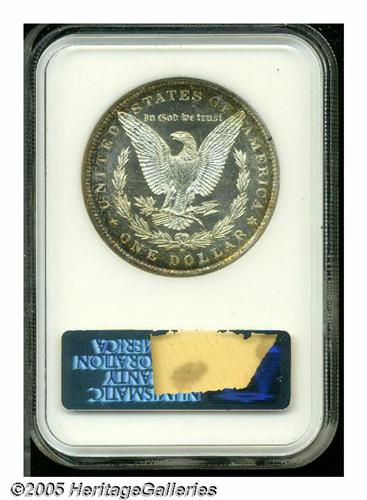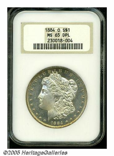 <B>1884-O<S$1> MS65 Deep Mirror Prooflike NGC.</B></I> Beautiful golden-brown, electric-blue, and rose colors embrace the margins of this nicely struck and prominently mirrored Gem. The cheek and the reverse are magnificently undisturbed.