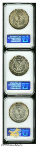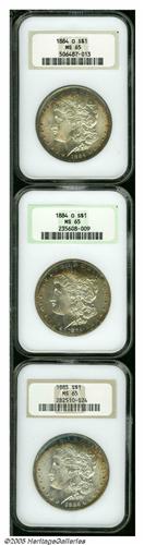 <B>1884-O<S$1> MS65 NGC,</B></I> gorgeous russet and apple-green colors cling to the borders, the centers are softly impressed; <B>1884-O MS65 NGC,</B></I> intricately struck, attractive honey, electric-blue and plum toning; and an <B>1885 MS65 NGC,</B></I> electric-blue and apricot patina surrounds the brilliant centers, not a complete strike. All three Gems are in older holders.