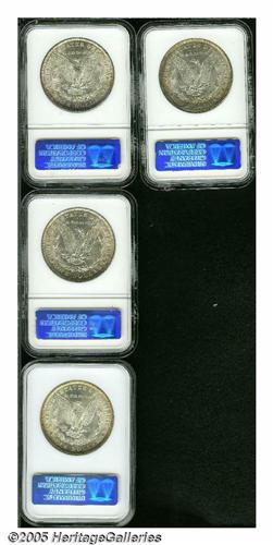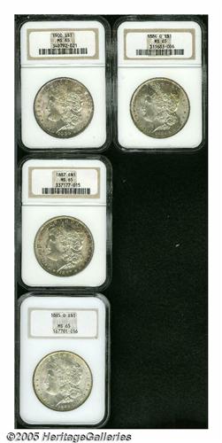 <B>1884-O<S$1> MS65 NGC,</B></I> splashes of honey-gold and navy-blue toning; <B>1885-O MS65 NGC,</B></I> well struck, lustrous, very clean, pleasing peripheral golden color; <B>1887 MS65 NGC,</B></I> VAM-12, A Top 100 Variety, golden-brown and apple-green freckles near the rims, a lustrous and bold 'Alligator Eye' example; and a <B>1900 MS65 NGC,</B></I> plum and tan hues enrich the margins, a clean cheek, a good strike.