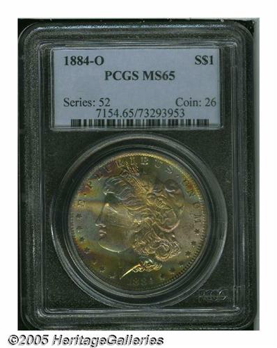 <B>1884-O<S$1> MS65 PCGS.</B></I> Lustrous surfaces are bathed by iridescent rainbow toning on the obverse, while the reverse is nearly untoned. The design features are for the most part adequately struck, save for the hair above Liberty's ear. Both sides are very well preserved.