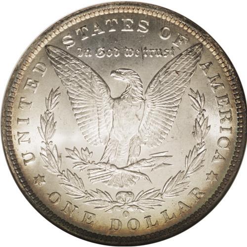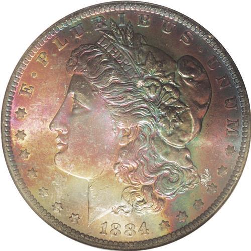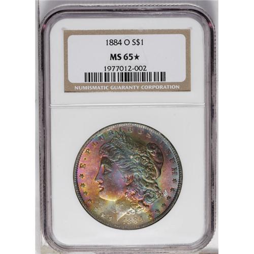 <B>1884-O<img border='0' src='http://www.heritagecoins.com/images/star.gif' width=10 height=10>$1> MS65 <img border='0' src='http://www.heritagecoins.com/images/star.gif' width=10 height=10> NGC.</B></I> Spectacularly toned on the obverse in many different colors, including antique-gold, magenta, electric-green, and steel-blue. The reverse is partially brilliant with pleasing peripheral shades of mint-green and golden-tan. Softly defined in the centers, and on the lower left portion of the wreath bow, with a couple of minor scrapes and abrasions on each side. The coveted "Star" designation, from NGC, seems well deserved by this lovely Gem.