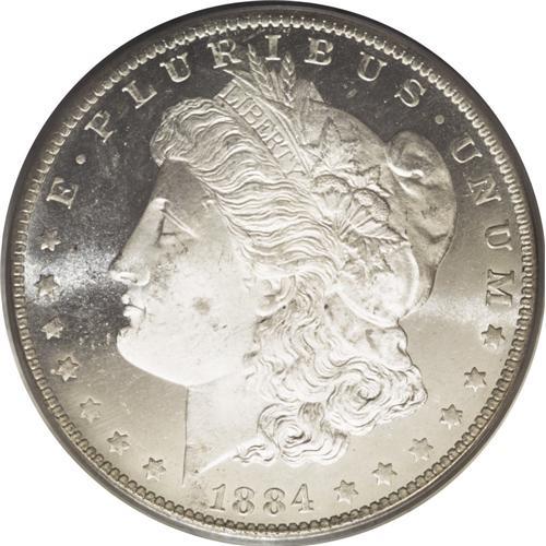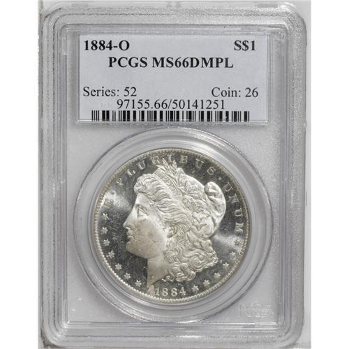 <B>1884-O<img border='0' src='http://www.heritagecoins.com/images/star.gif' width=10 height=10>$1> MS66 Deep Mirror Prooflike PCGS.</B></I> The strike, while near-complete, shows slight softness in the hair over Liberty's ear and the eagle's breast. The devices are frosted with a cameo appearance. No toning is present on either side of this glistening Gem. Population: 49 in 66 DMPL, 1 finer (7/06).