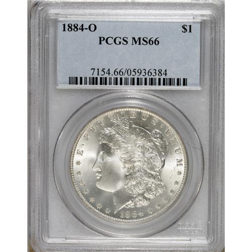 <B>1884-O S$1 MS66 PCGS.</B></I> Bright untoned surfaces exhibit fabulous luster, and reveal well impressed design features, though the centers show the usual weakness. Both sides are devoid of mentionable marks. The 1884-O is easily obtainable in the various Mint State grade levels (David Bowers, 2006).<BR><BR><b>Shipping:</b> Coins & Currency (<a target="_blank" href="http://www.heritageauctions.com/common/shipping.php">view shipping information</a>)