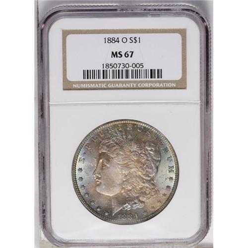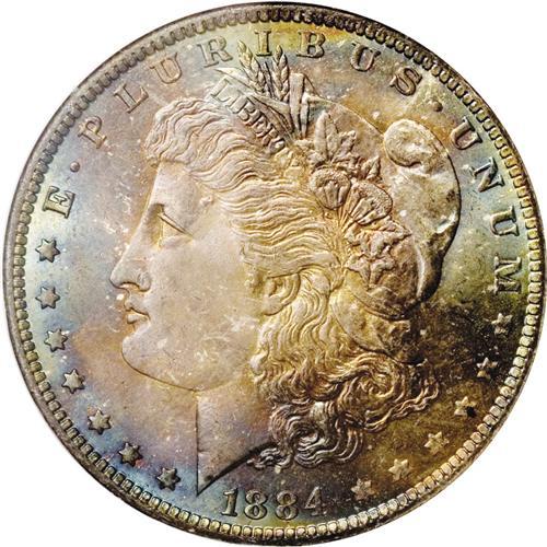 <B>1884-O<img border='0' src='http://www.heritagecoins.com/images/star.gif' width=10 height=10>$1> MS67 NGC.</B></I> A spot of deep crimson toning appears on the eagle's left (facing) wing, the only color on that otherwise untoned side, but the obverse patina has a spectacular array of colors, including teal, orange, lemon-yellow, and red-violet. NGC has certified none finer, and it is doubtful if a fraction of the other Superb Gems can match the eye appeal of this highly lustrous and sharply struck example.