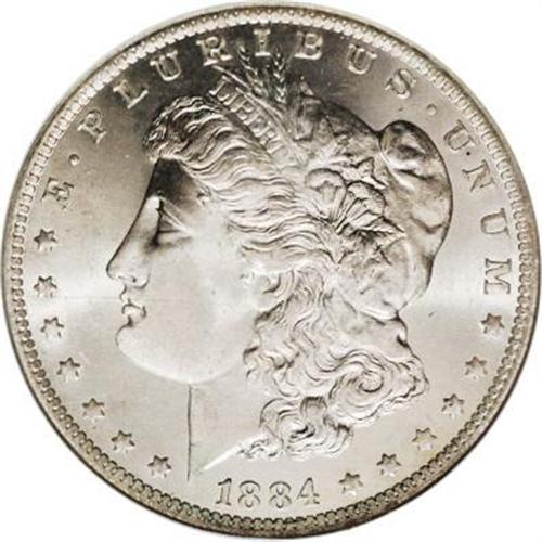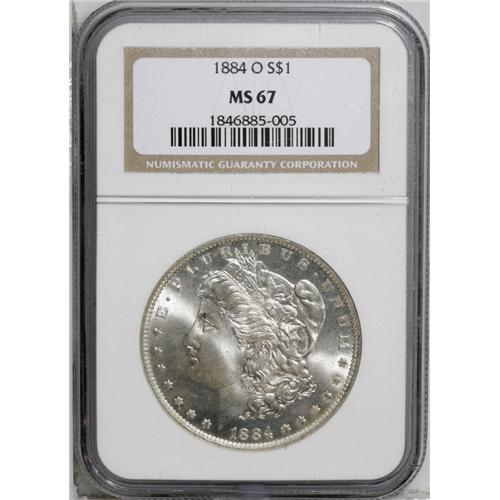 <B>1884-O<img border='0' src='http://www.heritagecoins.com/images/star.gif' width=10 height=10>$1> MS67 NGC.</B></I> An untoned and exuberantly brilliant example of this, the most common Morgan dollar in Mint State save for the ubiquitous 1921 issue. Not at all common in such a high grade, however: NGC has graded 59 pieces at this level, with none finer, while PCGS has graded only a single example finer (7/06). Surface distractions are nearly nonexistent, although a bit of light haze can be seen, primarily in the obverse fields. The strike is about average, with some softness on the hair above Liberty's ear.