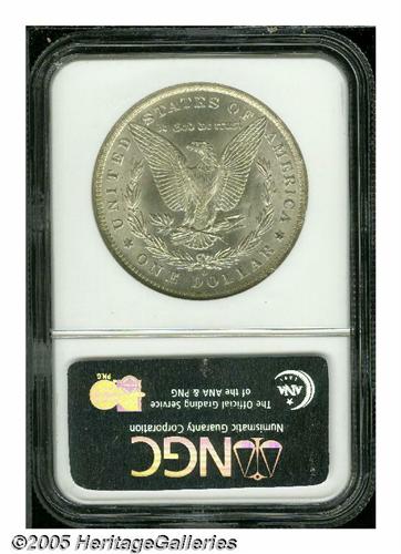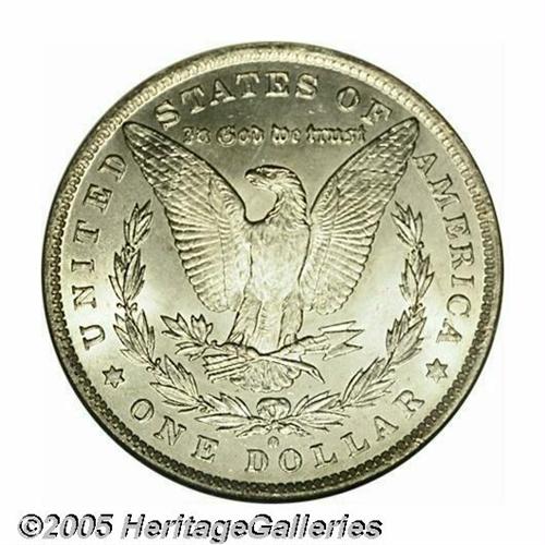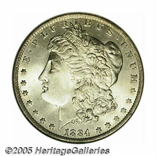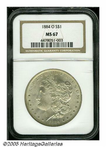 <B>1884-O<S$1> MS67 NGC.</B></I> In the case of the 1884-O Morgan Dollar, a mintage of more than 9.7 million pieces does correlate into ready availability in Mint State. Uncirculated survivors can sometimes be found with minimal abrasions, but are often poorly defined and display substandard luster. Everything comes together on this satiny, nearly untoned representative. In addition to being very well struck for an '84-O, both sides display nearly flawless surface quality. Population: 40 in 67, 0 finer (5/05).
