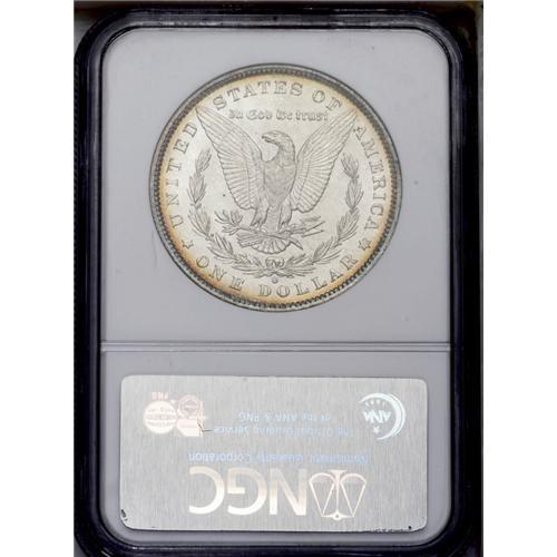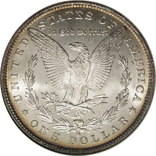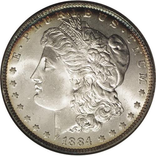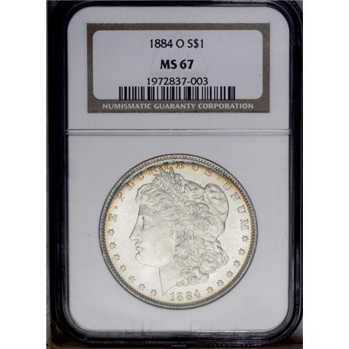 <B>1884-O<img border='0' src='http://www.heritagecoins.com/images/star.gif' width=10 height=10>$1> MS67 NGC.</B></I> The New Orleans Mint produced only silver dollars in 1884, and, as a result, 9.7 million coins flowed from the Southern facility that year. One would think that the mint staff, freed from producing other denominations, would have taken special care when striking this issue. On the contrary, finding a sharply struck '84-O on today's market is not a guarantee, and many coins are softly defined over the all-important central highpoints. Free of such distractions, this sharply struck coin possesses nearly unsurpassable technical quality for the issue. Russet, gold, and cobalt-blue peripheral toning frames the untoned centers, and only a few minute marks are evident on either side. A lovely, highly lustrous Superb Gem. NGC has graded 55 pieces in this grade, with none finer (3/06). <BR><BR><B>Important notice:</B> Heritage usually auctions material at the rate of 200-250 lots per hour. On some occasions eBay Live bid software or the Internet may not be able to keep up with the pace of the auction. We recommend placing a realistic absentee bid now as insurance to avoid disappointment. Occasionally the auctioneer may eliminate or reject an eBay Live bid, and the auctioneer may also reopen a lot after the close of the eBay live bidding (usually because we missed an audience bid), and may reject your bid even if it shows you as the winning bidder. By bidding via eBay Live, you agree that Heritage may award the lot to another bidder at its sole discretion under the circumstances described above or any other reasonable circumstances. Since eBay bids are not shown to us until we open the lot on the floor, we treat those bids just like floor bids. In most cases the floor responds before the eBay bid is presented to us, due to Internet lag time, so for consistency we have made it a policy that floor bids are always considered first over tie eBay live bids. Also please note that all Heritage lots purchased through eBay Live carry a 20% Buyer's Premium. Please make sure you read the Terms and Conditions before you bid. This lot is being auctioned in conjunction with a live floor auction by Heritage Galleries & Auctioneers. All final auction and invoice information will be supplied by Heritage Galleries & Auctioneers, and all other information should be considered preliminary. Lot:3403 <BR><BR><B>Winning Notification and Billing:</B> After the FINAL session in this auction is complete, Heritage will send e-mail and snail mail invoices. This process normally takes several days. All final auction and invoice information will be supplied by Heritage Galleries & Auctioneers, and all other information should be considered preliminary. <BR><BR>This auction will be conducted on a live auction floor and over the Internet through eBay Live. If you choose to place an absentee bid, please take a moment to <font color='#0000ff'><u><a href='http://pages.ebay.com/liveauctions/help/before/laabsentee.html'>learn how eBay Live absentee bidding works</a></u></font><font color='#000000'>