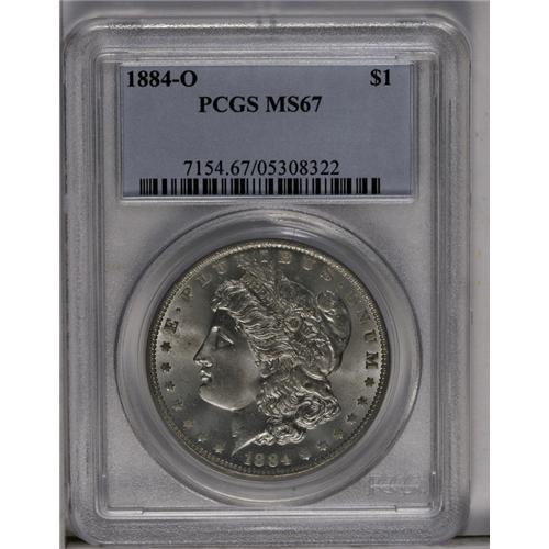 <B>1884-O<img border='0' src='http://www.heritagecoins.com/images/star.gif' width=10 height=10>$1> MS67 PCGS.</B></I> A brilliant Superb Gem that is essentially devoid of mentionable distractions, this coin offers incredible brilliance over its silver-white surfaces. Pleasingly well struck for this O-mint issue. Population: 49 in 67, 1 finer (6/06).