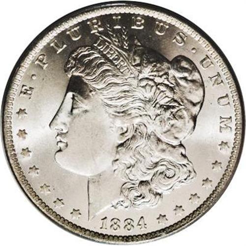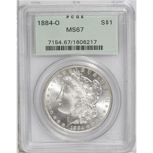 <B>1884-O<img border='0' src='http://www.heritagecoins.com/images/star.gif' width=10 height=10>$1> MS67 PCGS.</B></I> An untoned and beautifully brilliant specimen that offers abundant cartwheel luster. Surface abrasions are light and undistracting, and the strike is a bit above average, although still soft on the hair above the ear. Certified in a green-label holder.