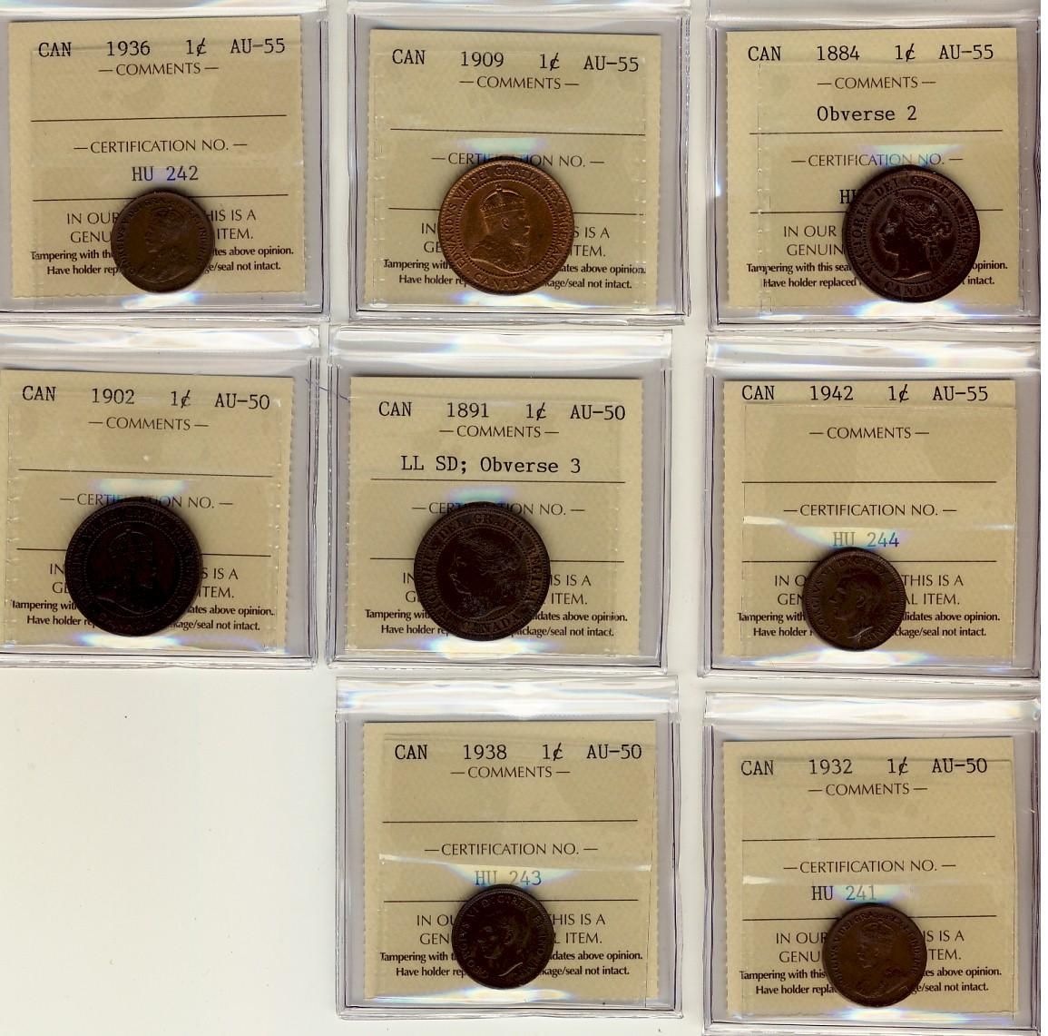 1884 Obv 2, 1909, 1936, 1942 1¢ AU55 and 1891 LLSD Obv 3, 1902, 1932 & 1938 AU50. Lot of 8 coins all ICCS graded.