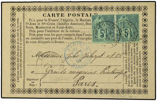 1884 Postal stationary card addressed to FRANCE bearing French General Colonies 5 c green (pair) (Yvert 49) tied by BASSE-TERRE GUADELOUPE double ring with PARIS/ETRANGER entry cachet in blue and PARIS arrival on front. Very fine and scarce.