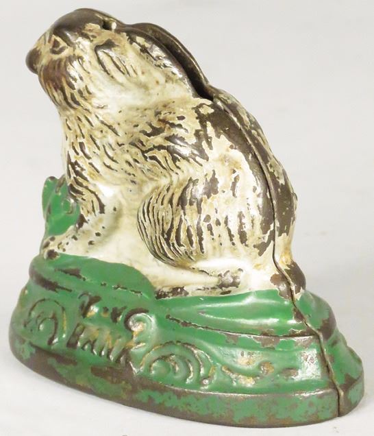 1884 Rabbit on Base Cast Iron Bank. Most of original paint intact. 3 inches long.