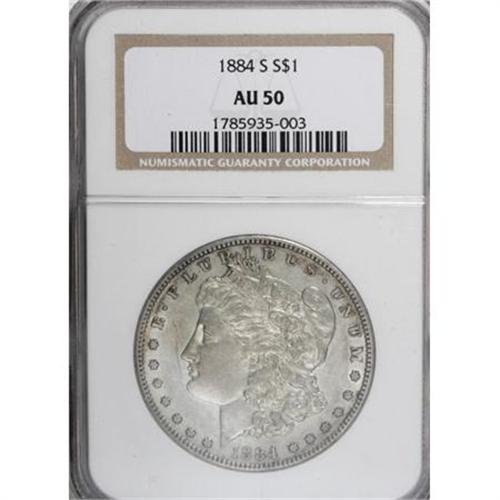 <B>1884-S $1 AU50 NGC.</B></I> . NGC Census: (675/3217). PCGS Population (681/2388). Mintage: 3,200,000. Numismedia Wsl. Price for NGC/PCGS coin in AU50: $225. (#7156)<BR><BR><B>Coin Engraver:</B> George T. Morgan<BR><BR><b>Shipping:</b> Coins & Currency (<a target="_blank" href="http://www.heritageauctions.com/common/shipping.php">view shipping information</a>)