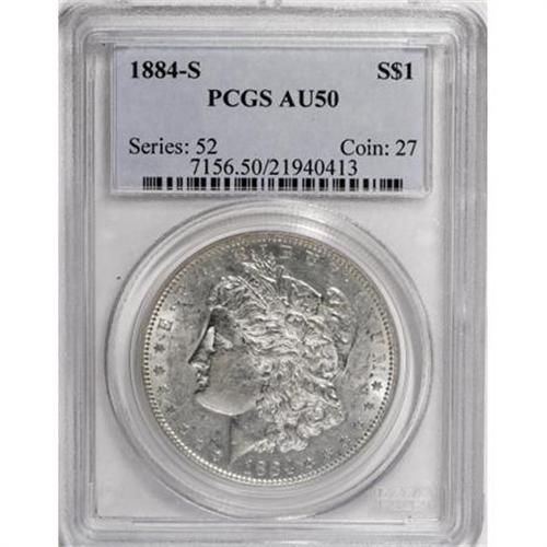 <B>1884-S $1 AU50 PCGS.</B></I> PCGS Population (678/2358). NGC Census: (670/3153). Mintage: 3,200,000. Numismedia Wsl. Price for NGC/PCGS coin in AU50: $225. (#7156)<BR><BR><B>Coin Engraver:</B> George T. Morgan<BR><BR><b>Shipping:</b> Coins & Currency (<a target="_blank" href="http://www.heritageauctions.com/common/shipping.php">view shipping information</a>)