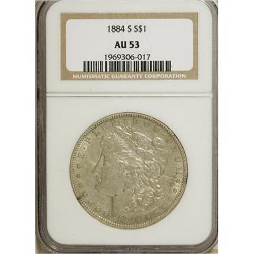 <B>1884-S $1 AU53 NGC.</B></I> NGC Census: (724/2525). PCGS Population (641/1779). Mintage: 3,200,000. Numismedia Wsl. Price for NGC/PCGS coin in AU53: $325. (#7156)<BR><BR><B>Coin Engraver:</B> George T. Morgan<BR><BR><b>Shipping:</b> Coins & Currency (<a target="_blank" href="http://www.heritageauctions.com/common/shipping.php">view shipping information</a>)