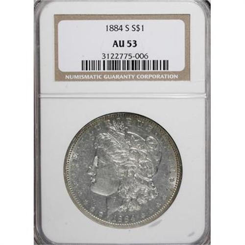 <B>1884-S $1 AU53 NGC.</B></I> NGC Census: (724/2525). PCGS Population (641/1779). Mintage: 3,200,000. Numismedia Wsl. Price for NGC/PCGS coin in AU53: $325. (#7156)<BR><BR><B>Coin Engraver:</B> George T. Morgan<BR><BR><b>Shipping:</b> Coins & Currency (<a target="_blank" href="http://www.heritageauctions.com/common/shipping.php">view shipping information</a>)