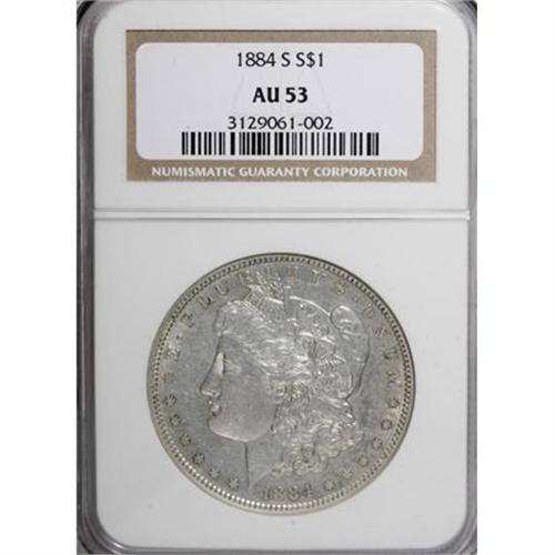 <B>1884-S $1 AU53 NGC.</B></I> NGC Census: (731/2551). PCGS Population (644/1795). Mintage: 3,200,000. Numismedia Wsl. Price for NGC/PCGS coin in AU53: $325. (#7156)<BR><BR><B>Coin Engraver:</B> George T. Morgan<BR><BR><b>Shipping:</b> Coins & Currency (<a target="_blank" href="http://www.heritageauctions.com/common/shipping.php">view shipping information</a>)