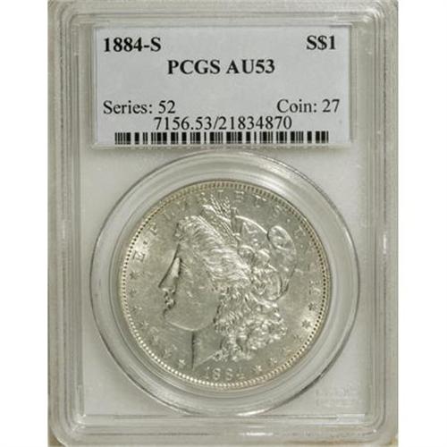 <B>1884-S $1 AU53 PCGS.</B></I> PCGS Population (644/1793). NGC Census: (727/2545). Mintage: 3,200,000. Numismedia Wsl. Price for NGC/PCGS coin in AU53: $325. (#7156)<BR><BR><B>Coin Engraver:</B> George T. Morgan<BR><BR><b>Shipping:</b> Coins & Currency (<a target="_blank" href="http://www.heritageauctions.com/common/shipping.php">view shipping information</a>)