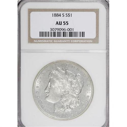 <B>1884-S $1 AU55 NGC.</B></I> . NGC Census: (1014/1483). PCGS Population (975/775). Mintage: 3,200,000. Numismedia Wsl. Price for NGC/PCGS coin in AU55: $585. (#7156)<BR><BR><B>Coin Engraver:</B> George T. Morgan<BR><BR><b>Shipping:</b> Coins & Currency (<a target="_blank" href="http://www.heritageauctions.com/common/shipping.php">view shipping information</a>)