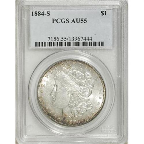 <B>1884-S $1 AU55 PCGS.</B></I> PCGS Population (942/746). NGC Census: (961/1399). Mintage: 3,200,000. Numismedia Wsl. Price for NGC/PCGS coin in AU55: $585. (#7156)<BR><BR><B>Coin Engraver:</B> George T. Morgan<BR><BR><b>Shipping:</b> Coins & Currency (<a target="_blank" href="http://www.heritageauctions.com/common/shipping.php">view shipping information</a>)