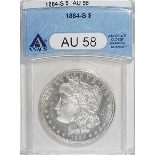 <B>1884-S $1 AU58 ANACS.</B></I> Well struck and free of toning, with prooflike fields and lightly frosted devices. Traces of highpoint wear and numerous small abrasions define the grade of this near-Mint example. <BR><BR><b>Shipping:</b> Coins & Currency (<a target="_blank" href="http://www.heritageauctions.com/common/shipping.php">view shipping information</a>)
