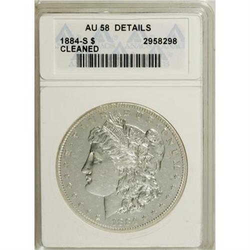 <B>1884-S $1 --Cleaned--ANACS. AU58 Details.</B></I> NGC Census: (1042/346). PCGS Population (510/228). Mintage: 3,200,000. Numismedia Wsl. Price for NGC/PCGS coin in AU58: $1,225. (#7156)<BR><BR><B>Coin Engraver:</B> George T. Morgan<BR><BR><b>Shipping:</b> Coins & Currency (<a target="_blank" href="http://www.heritageauctions.com/common/shipping.php">view shipping information</a>\)
