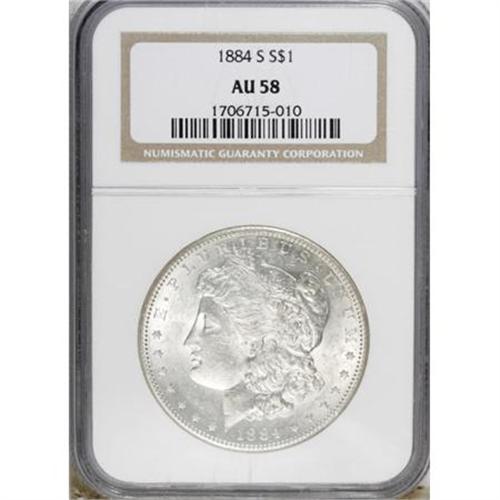 <B>1884-S $1 AU58 NGC.</B></I> A highly lustrous and nearly Mint State example of this conditionally rare date. Most survivors are well circulated as the vast majority of those struck actually served their purpose in commerce.<BR><BR><B>Coin Engraver:</B> George T. Morgan<BR><BR><b>Shipping:</b> Coins & Currency (<a target="_blank" href="http://www.heritageauctions.com/common/shipping.php">view shipping information</a>)