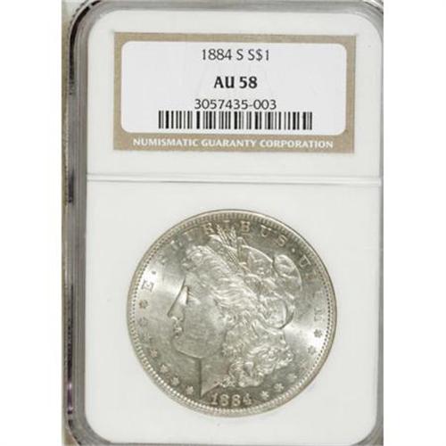 <B>1884-S $1 AU58 NGC.</B></I> A splendid and important near-Mint example of this elusive and conditionally rare date. Both sides have hints of wear and bright silver luster.<BR><BR><B>Coin Engraver:</B> George T. Morgan<BR><BR><b>Shipping:</b> Coins & Currency (<a target="_blank" href="http://www.heritageauctions.com/common/shipping.php">view shipping information</a>)