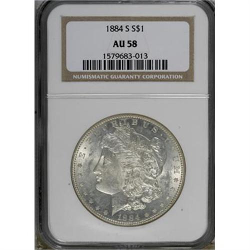 <B>1884-S $1 AU58 NGC.</B></I> Powerful cartwheel luster shines beneath thin silver-gray piece on this attractive S-mint Morgan dollar. The well-defined portrait and the nearby fields show myriad light abrasions, but only a trace of friction.<BR><BR><B>Coin Engraver:</B> George T. Morgan<BR><BR><b>Shipping:</b> Coins & Currency (<a target="_blank" href="http://www.heritageauctions.com/common/shipping.php">view shipping information</a>)