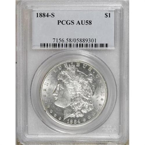 <B>1884-S $1 AU58 PCGS.</B></I> PCGS Population (560/231). NGC Census: (1144/358). Mintage: 3,200,000. Numismedia Wsl. Price for NGC/PCGS coin in AU58: $1,225. (#7156)<BR><BR><B>Coin Engraver:</B> George T. Morgan<BR><BR><b>Shipping:</b> Coins & Currency (<a target="_blank" href="http://www.heritageauctions.com/common/shipping.php">view shipping information</a>)