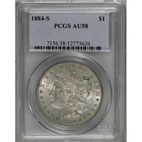 <B>1884-S $1 AU58 PCGS.</B></I> This is the last grade level that remains relatively available and reasonably inexpensive for the average collector. In Mint State, the 1884-S Morgan dollar immediately becomes scarce and very expensive, even at MS60. This near-Mint example is quite attractive and seems to possess more than an average amount of luster for the grade. A handful of small abrasions are noted on the obverse. Both sides show a muted silver-blue cast. <BR><BR><B>Coin Engraver:</B> George T. Morgan<BR><BR><b>Shipping:</b> Coins & Currency (<a target="_blank" href="http://www.heritageauctions.com/common/shipping.php">view shipping information</a>)