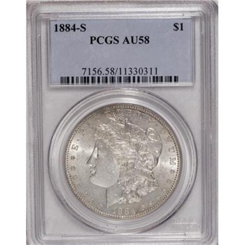 <B>1884-S $1 AU58 PCGS.</B></I> Bright surfaces exhibit considerable luster and whispers of tan-gold color that are slightly deeper in hue around the reverse peripheries. The design elements are well defined, better so than is typical for the issue. A few minor marks that are consistent with the grade are noted on the cheek and in the left obverse field.<BR><BR><B>Coin Engraver:</B> George T. Morgan<BR><BR><b>Shipping:</b> Coins & Currency (<a target="_blank" href="http://www.heritageauctions.com/common/shipping.php">view shipping information</a>)