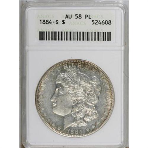 <B>1884-S $1 AU58 Prooflike ANACS.</B></I> The fields retain distinct reflectivity despite a trace of friction on the highpoints. Well struck for this S-mint issue with elements of reddish-orange patina at the margins.<BR><BR><B>Coin Engraver:</B> George T. Morgan<BR><BR><b>Shipping:</b> Coins & Currency (<a target="_blank" href="http://www.heritageauctions.com/common/shipping.php">view shipping information</a>)