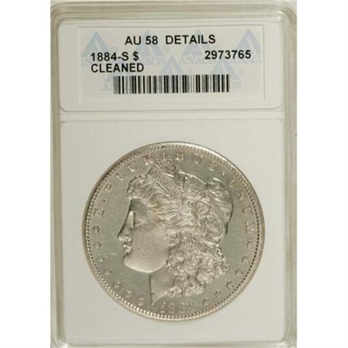 <B>1884-S $1 --Cleaned--ANACS. AU58 Details.</B></I> NGC Census: (1027/343). PCGS Population (498/235). Mintage: 3,200,000. Numismedia Wsl. Price for NGC/PCGS coin in AU58: $1,225. (#7156)<BR><BR><b>Shipping:</b> Coins & Currency (<a target="_blank" href="http://www.heritageauctions.com/common/shipping.php">view shipping information</a>)